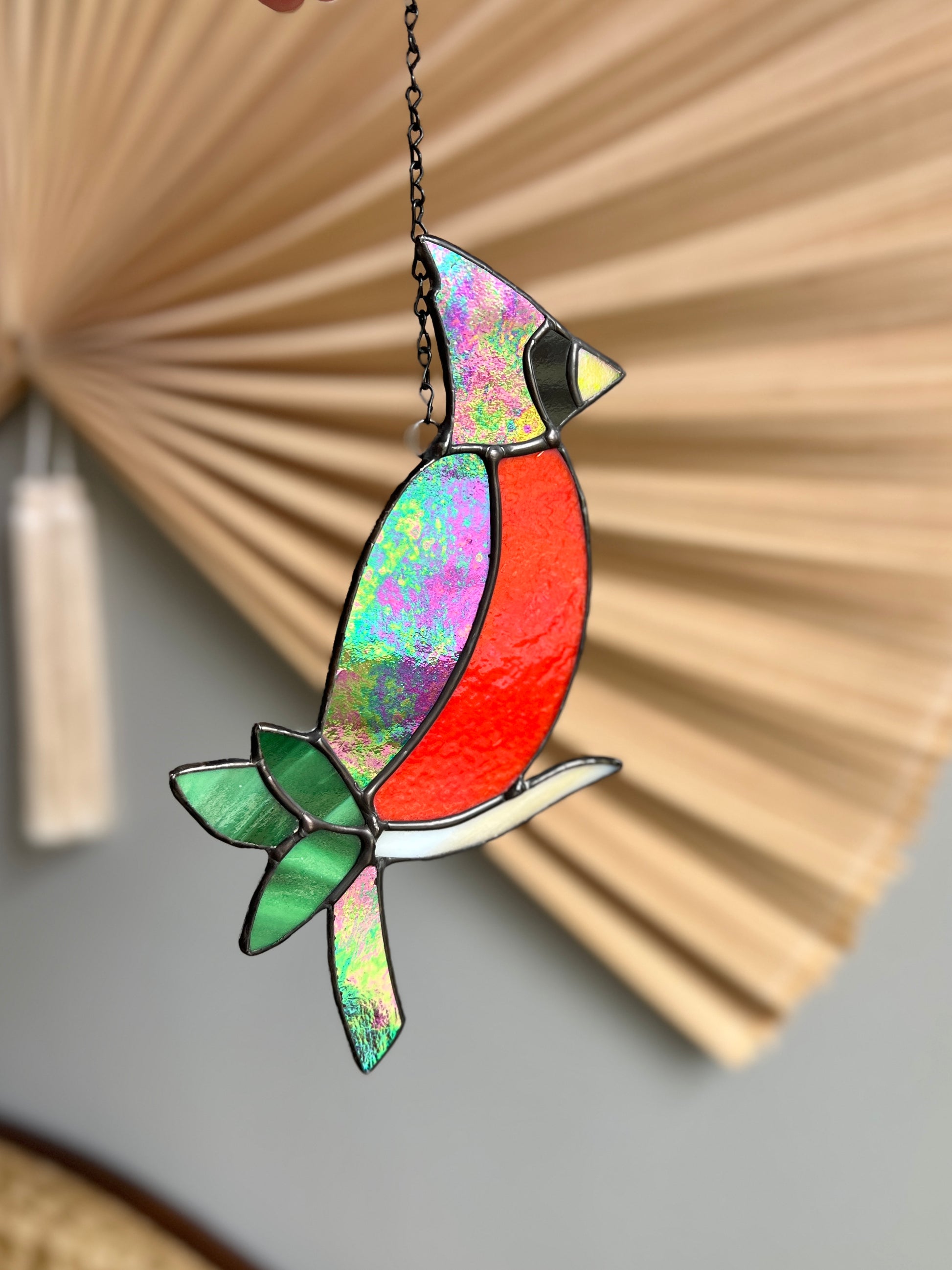 This Cardinal is made with a combination of transparent and iridescent red glass. He sits at an angle on a leafy branch. The glass used in this design gives a new look in every light.